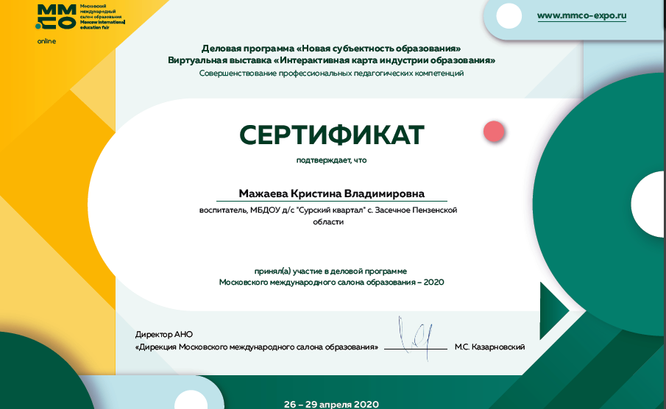 2019 год – Диплом о прохождении обучения на форуме «Педагоги России: инновации в образовании». Директор Всероссийского форума «Педагоги России: инновации в образовании» В.В.Пиджаков.