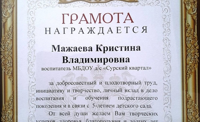 Я - Мажаева Кристина Владимировна, воспитатель детского сада "Сурский квартал" село Засечное Пензенского района Пензенской области. Родилась 26 февраля 1991 года. Замужем, есть сын. Очень люблю детей. Являюсь волонтером, бойцом РСО, водителем-автолюбителем и занимаюсь рукоделием.